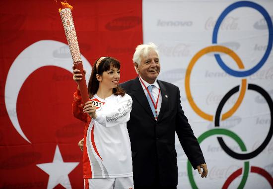 4月3日,土耳其第一棒火炬手图巴·卡拉狄米尔(左)与土耳其奥委会主席托艾·巴亚特利一起展示北京奥运会火炬。当日,北京奥运会圣火传递活动在土耳其伊斯坦布尔进行,这是北京奥运会圣火境外传递第二站。